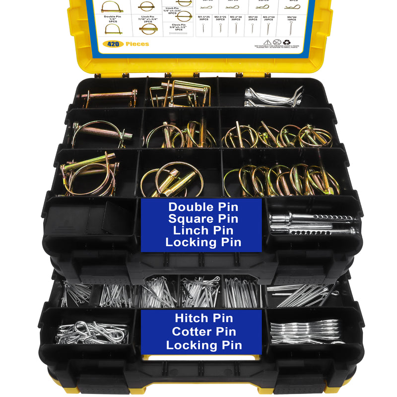Packing: 420PCS hitch pins clip pins are packed in a heavy duty double side organizer with removable dividers, which saves space and is portable, can help you find the lock pin you need quickly. If the locking pins in the box are used up, the box can also be used to hold other things